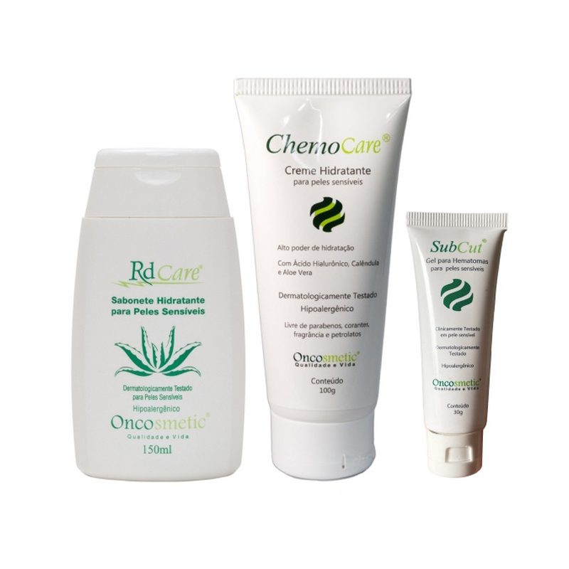 O Chemocare promove hidratação profunda e fortalece a barreira cutânea, o Subcut Gel atua diretamente na prevenção e melhora de hematomas, reduzindo desconfortos locais, e o Sabonete Hidratante limpa delicadamente sem agredir a pele.